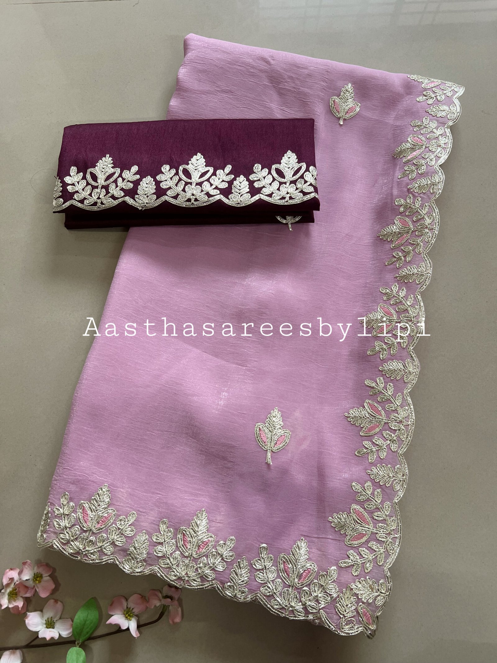 Details: Soft Shimmer Chiffon fabric Soft and flowy and shiny Pheta work border butta Raw silk light work blouse