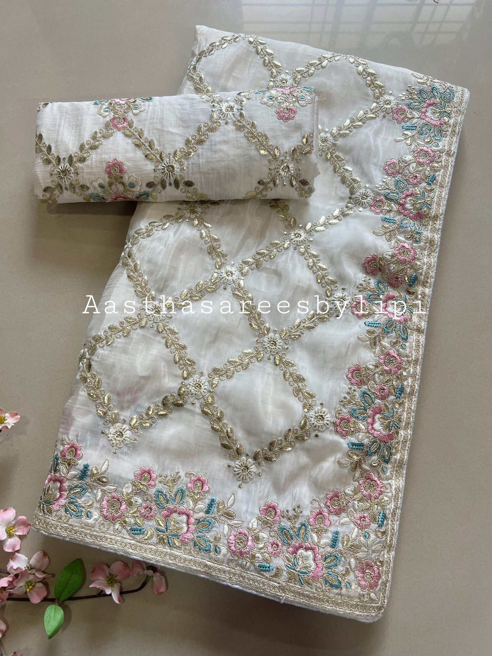 Details: Shimmer silk fabric Thread embroidered jaal work Exclusive pink blue thread work border Soft silk heavy blouse