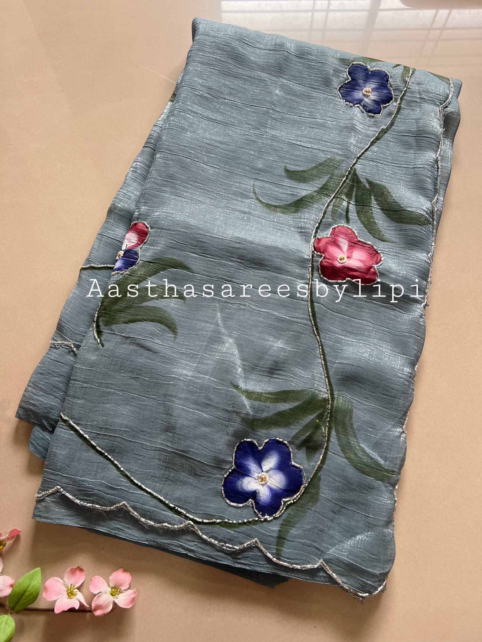 Details: Shimmer Chiffon fabric Soft and flowy and shiny Painted saree Hand work border Same fabric blouse