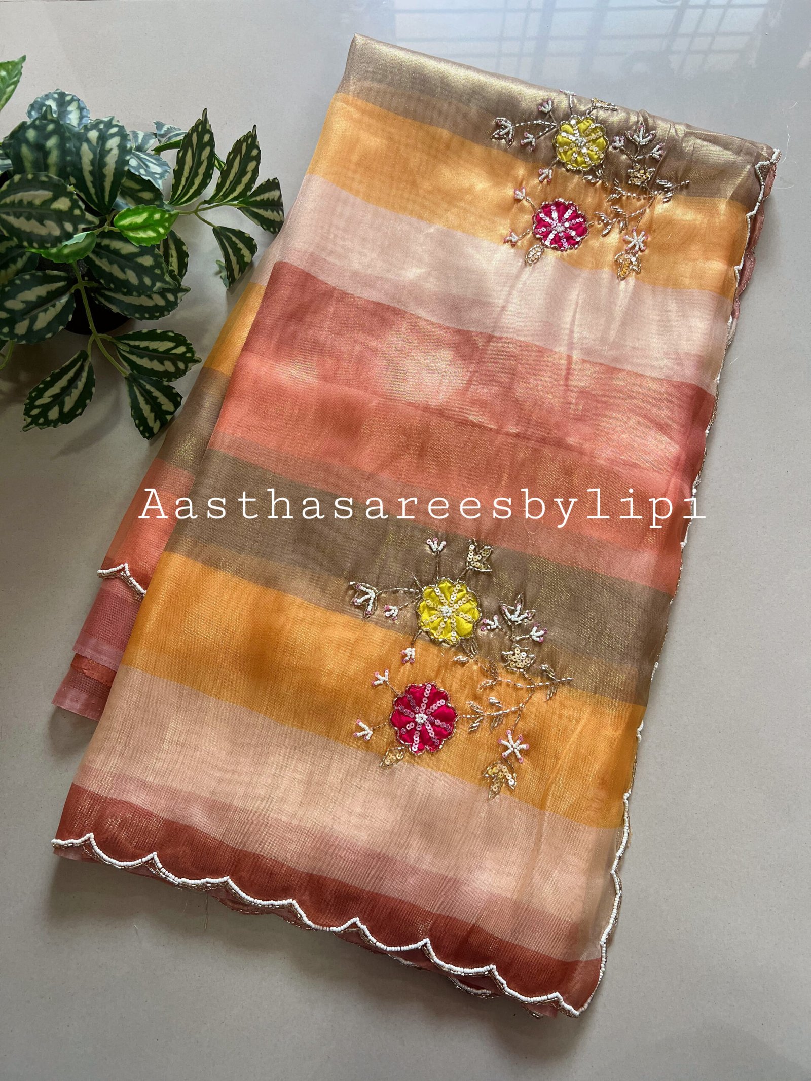 Details: Tissue shimmer fabric Soft flowy shiny Hand work butta Cut work border With light work blouse