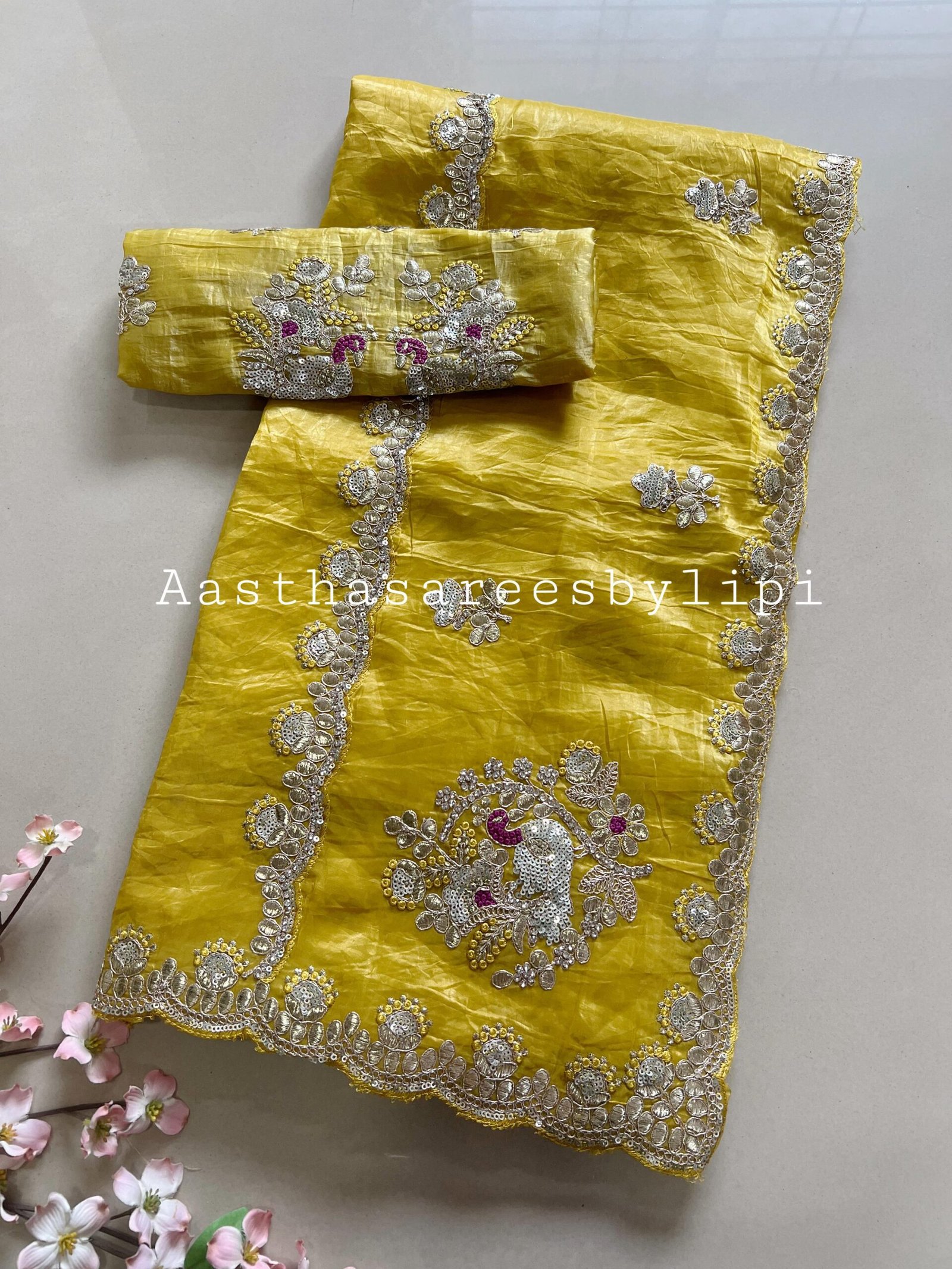 Details: Soft crush organza fabric Sequins thread work butta border Exclusive pallu Heavy blouse