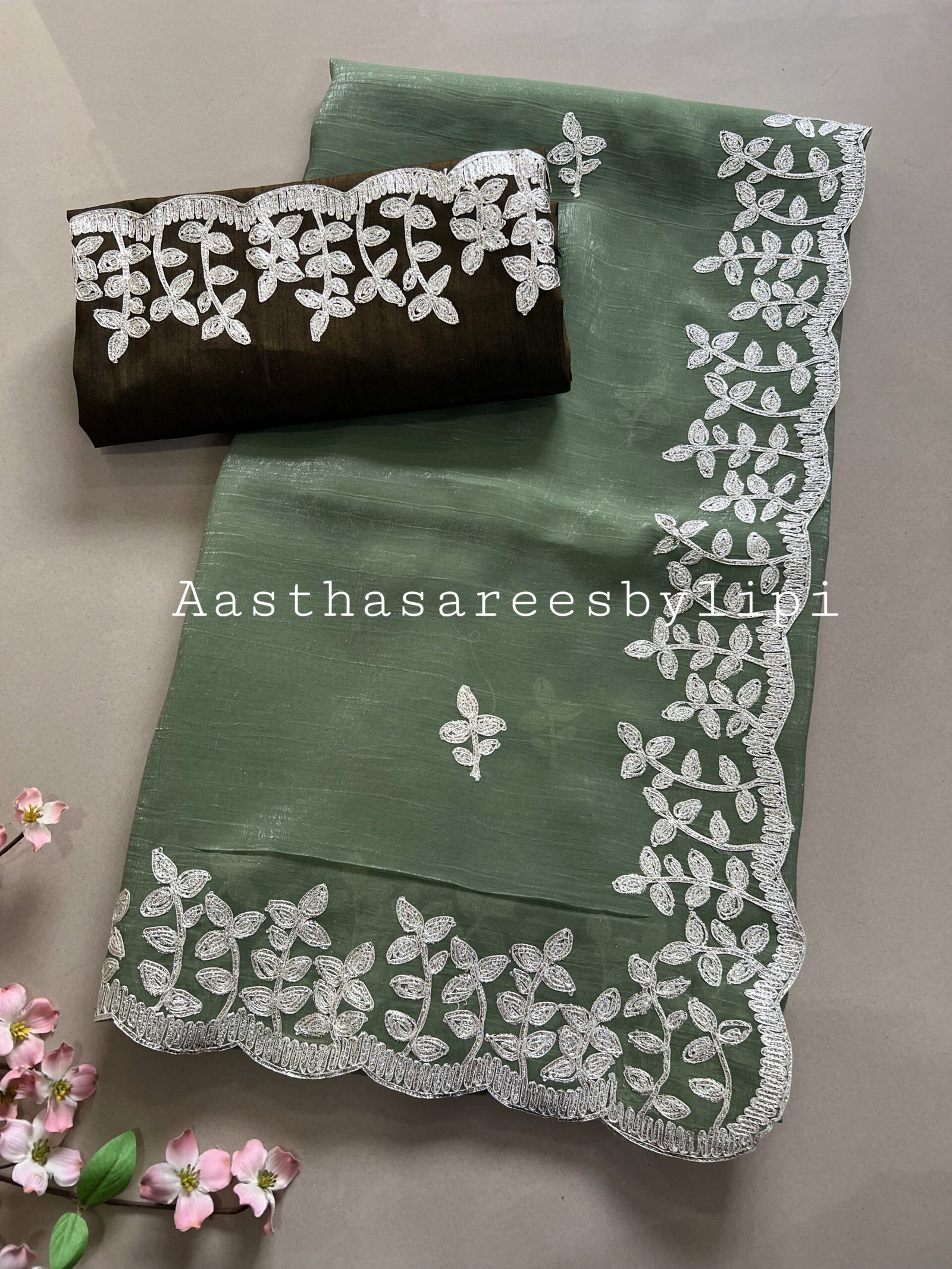Details: Soft Shimmer Chiffon fabric Soft and flowy and shiny Pheta work border butta Raw silk light work blouse