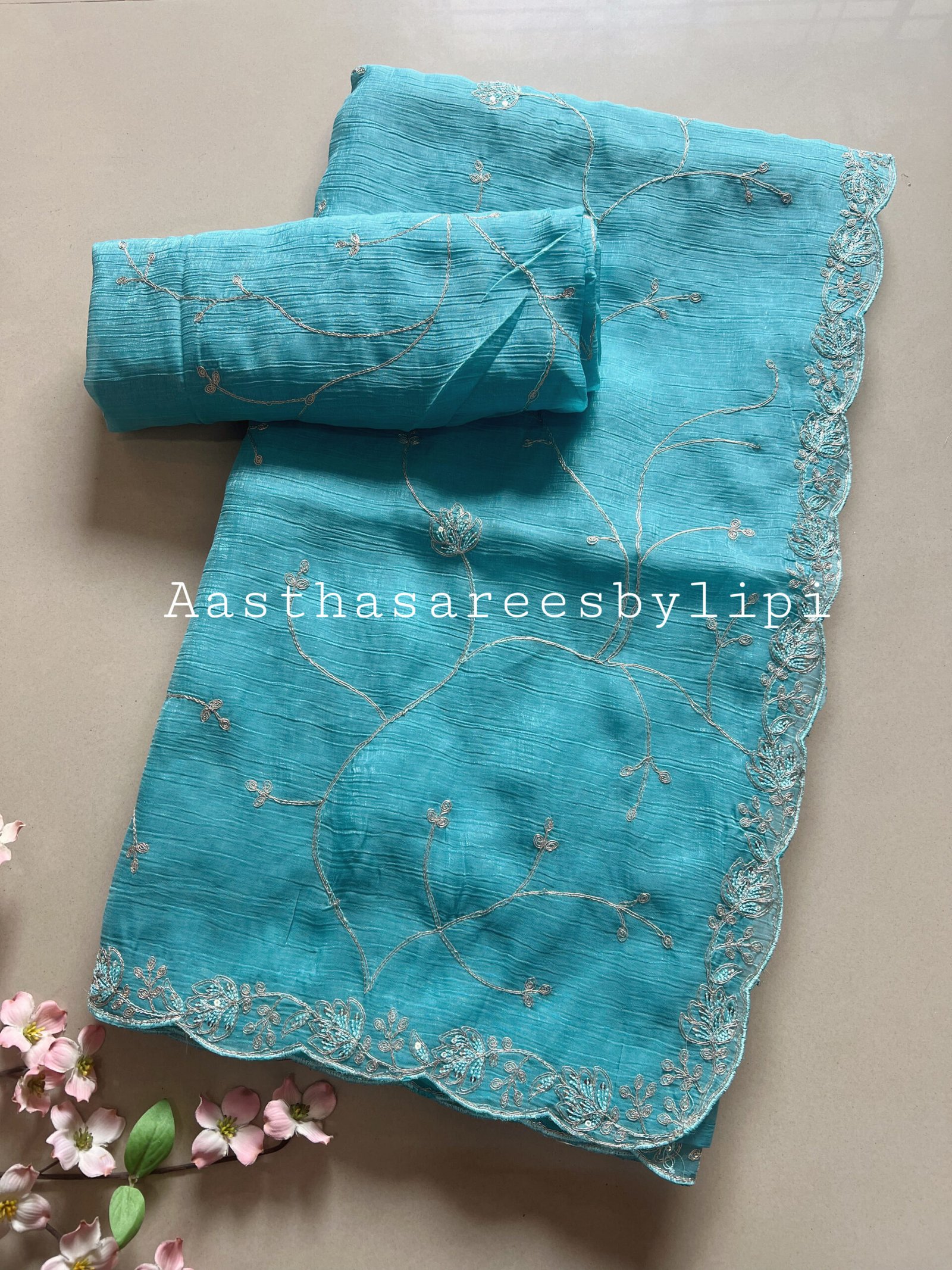 Details: Soft shimmer chiffon fabric Jaal minimal pitta work with border Light work blouse