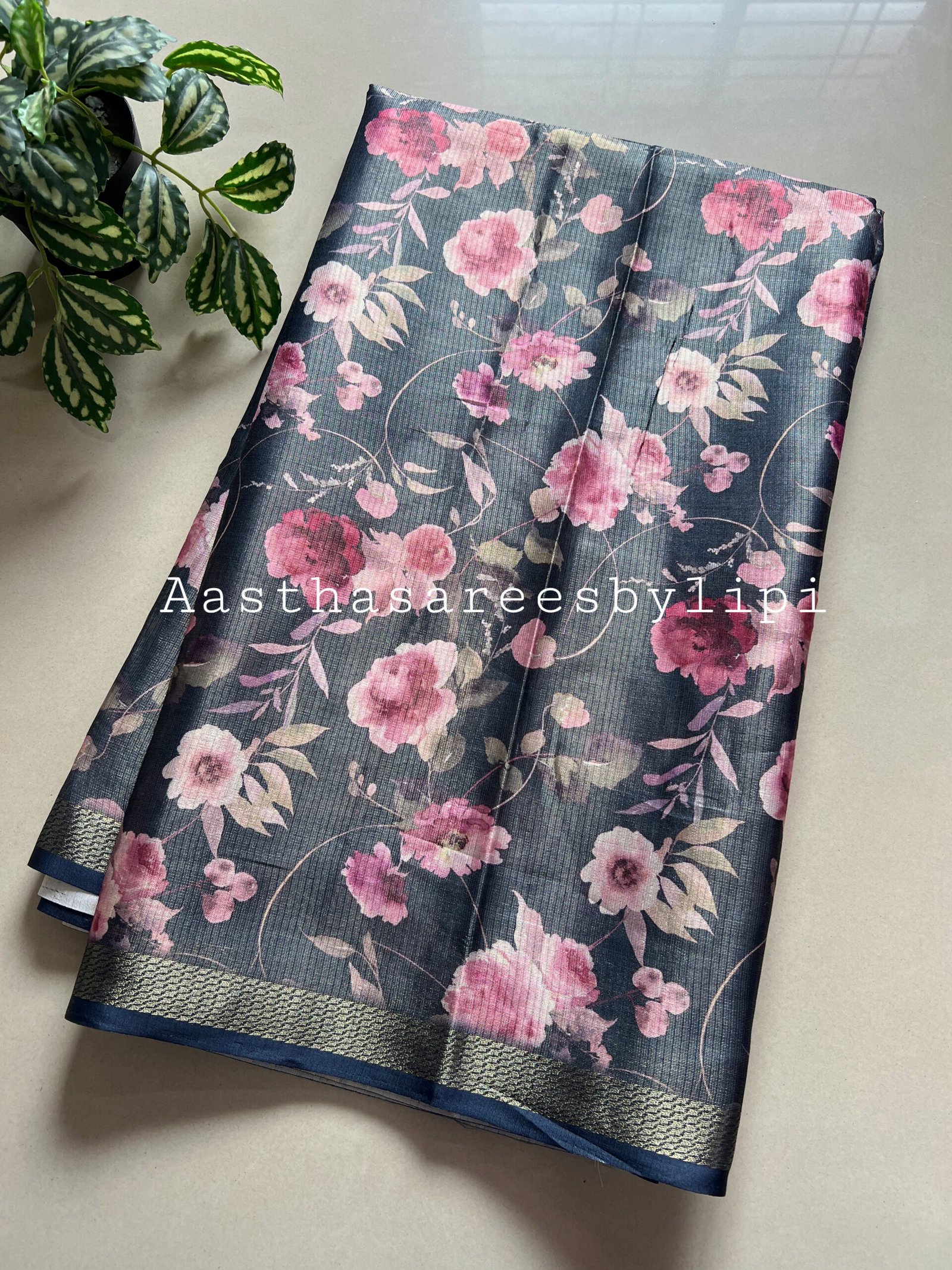 Dark Blue Floral Print Silk Saree