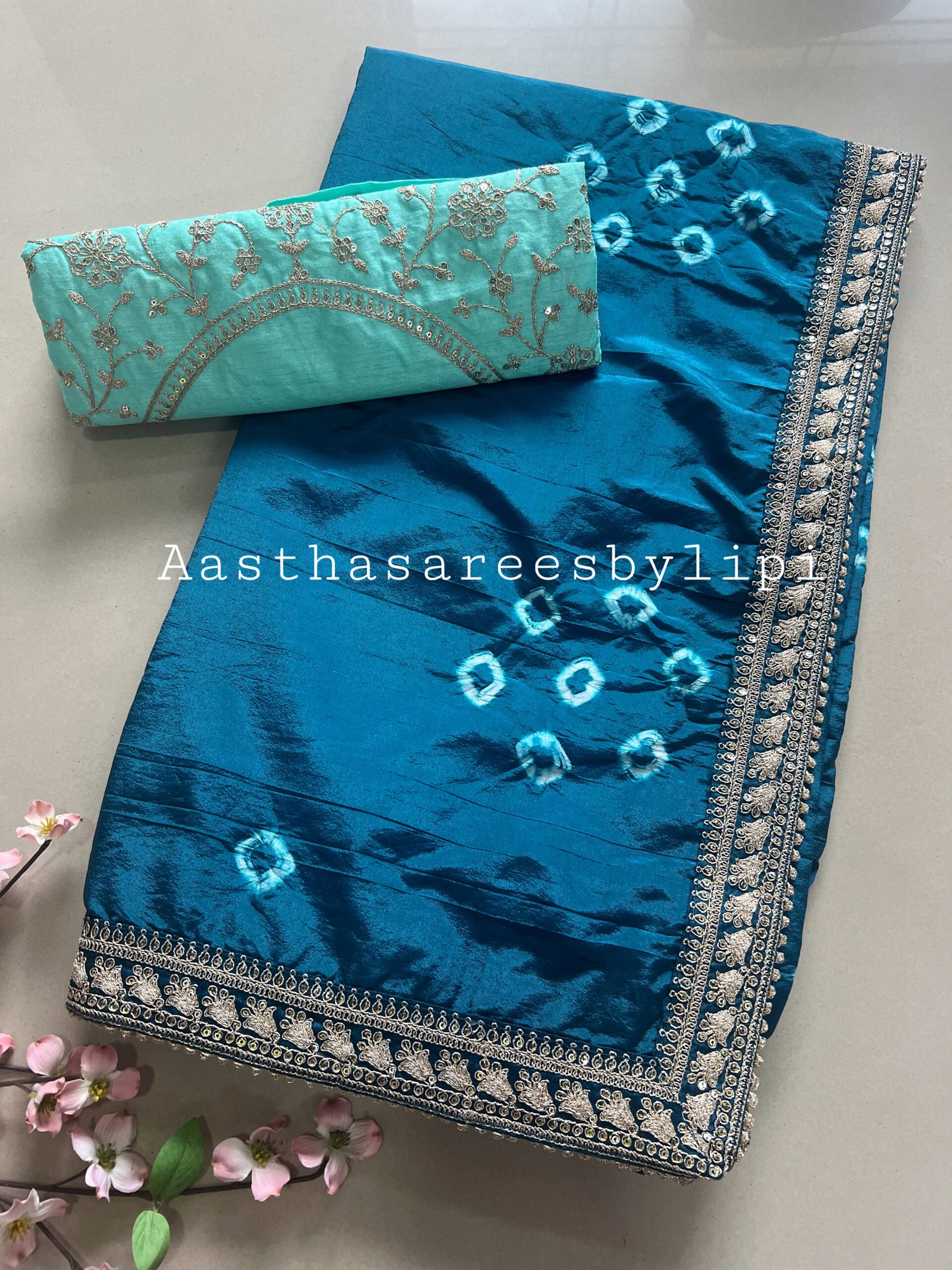 Details: Semi Soft Silk fabric Shibori tie and dye Lace border attached Contrast heavy blouse