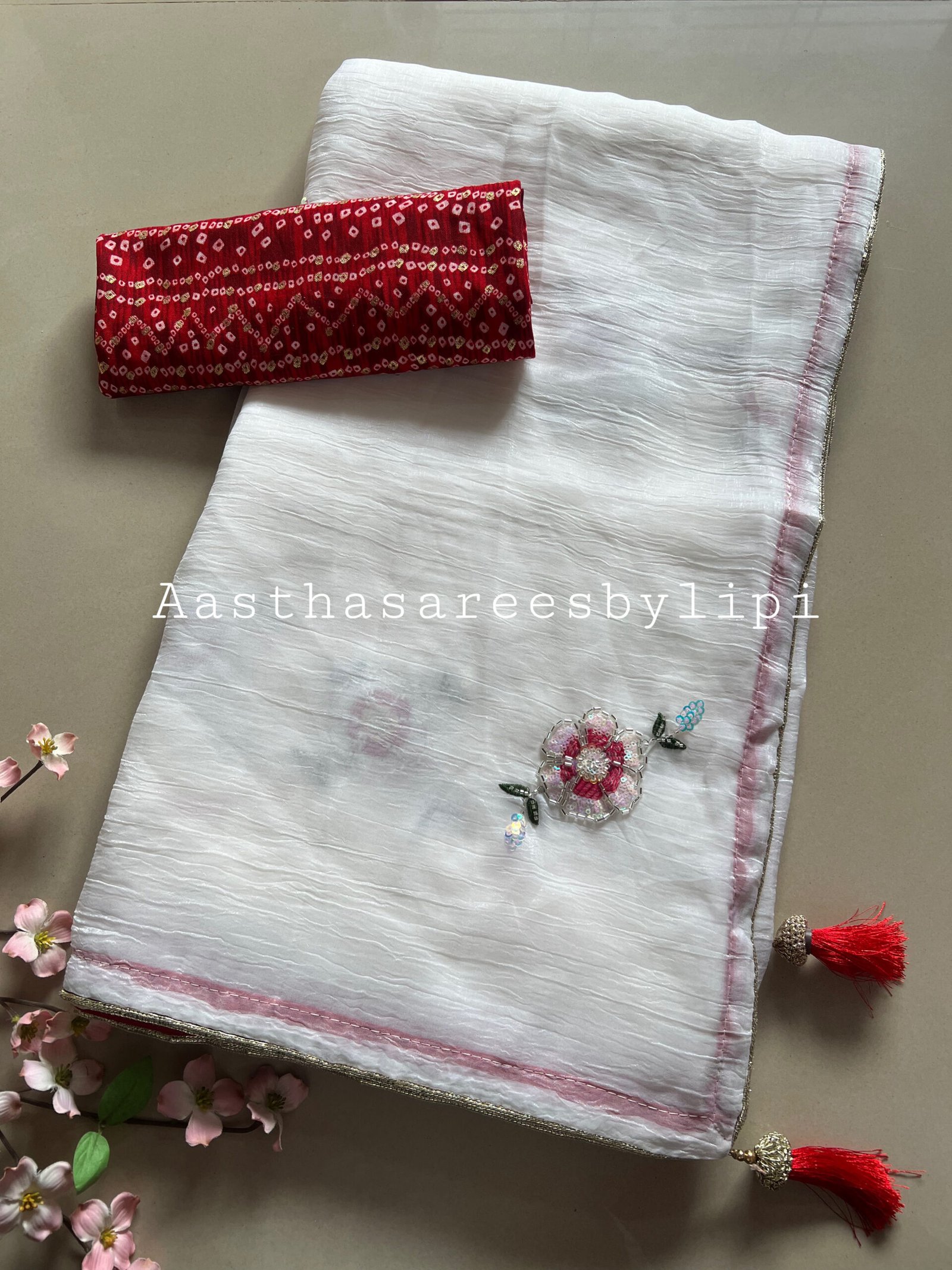Details: Shimmer chiffon fabric Sequins hand work butta Piping lace border Red Bandhani Rayon blouse