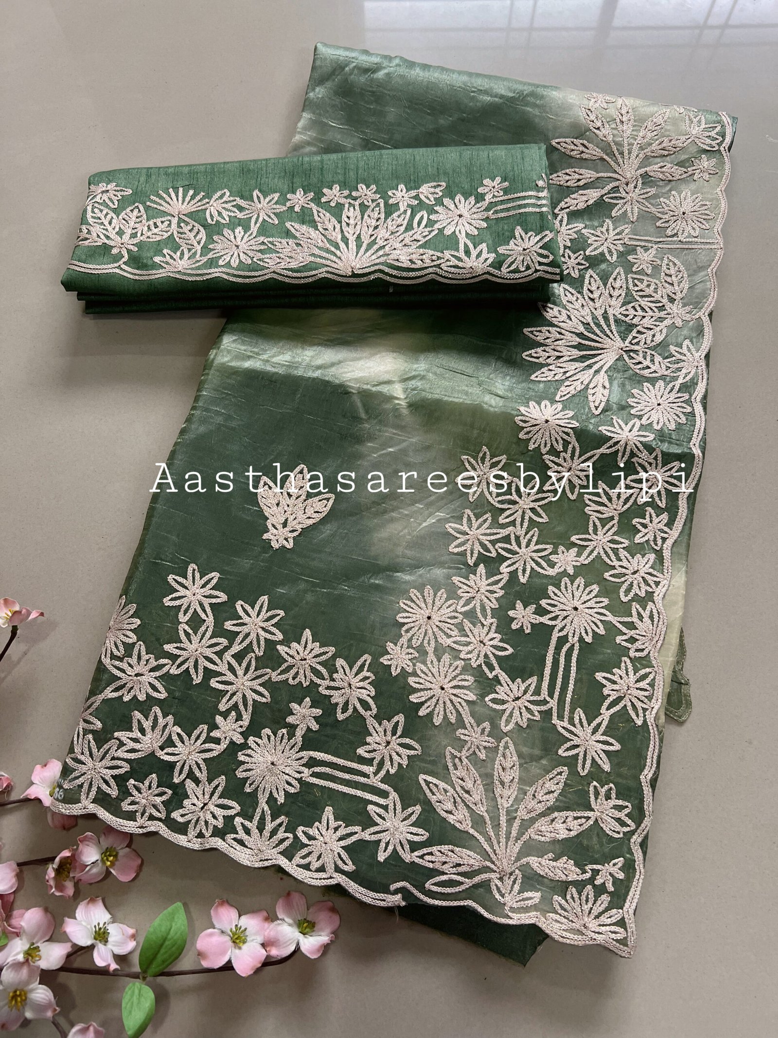 Details: Softest Organza fabric Shiny and semi transparent Semi pheta work border and butta Raw silk light work blouse